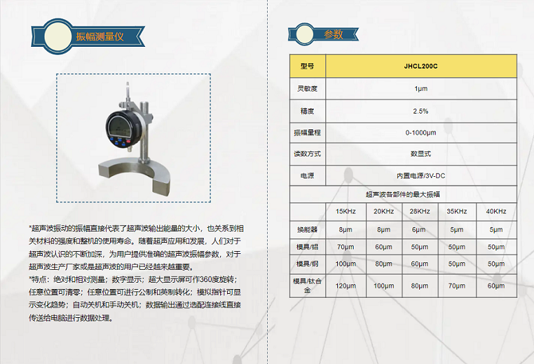 超聲波振動部分接觸到超聲波振幅測量儀的測試桿時(shí)測試桿會進(jìn)行伸縮運(yùn)動,通過高精密傳感器的測量把振幅顯示在顯示器上。超聲波振幅指超聲波焊接設(shè)備的振幅,通常頻率在10kHz~60kHz之間,振幅在1μm~200μm之間,由于頻率高、振幅小測量難度也較大,對測量精度提出了很高的要求。常用的測試手段對它無能為力,故很難測量。一般只能用激光測振儀進(jìn)行測量,能得到較好的結(jié)果。但激光測振設(shè)備價(jià)格昂貴,操作復(fù)雜。生產(chǎn)單位和專業(yè)的研究設(shè)計(jì)單位都很少使用。