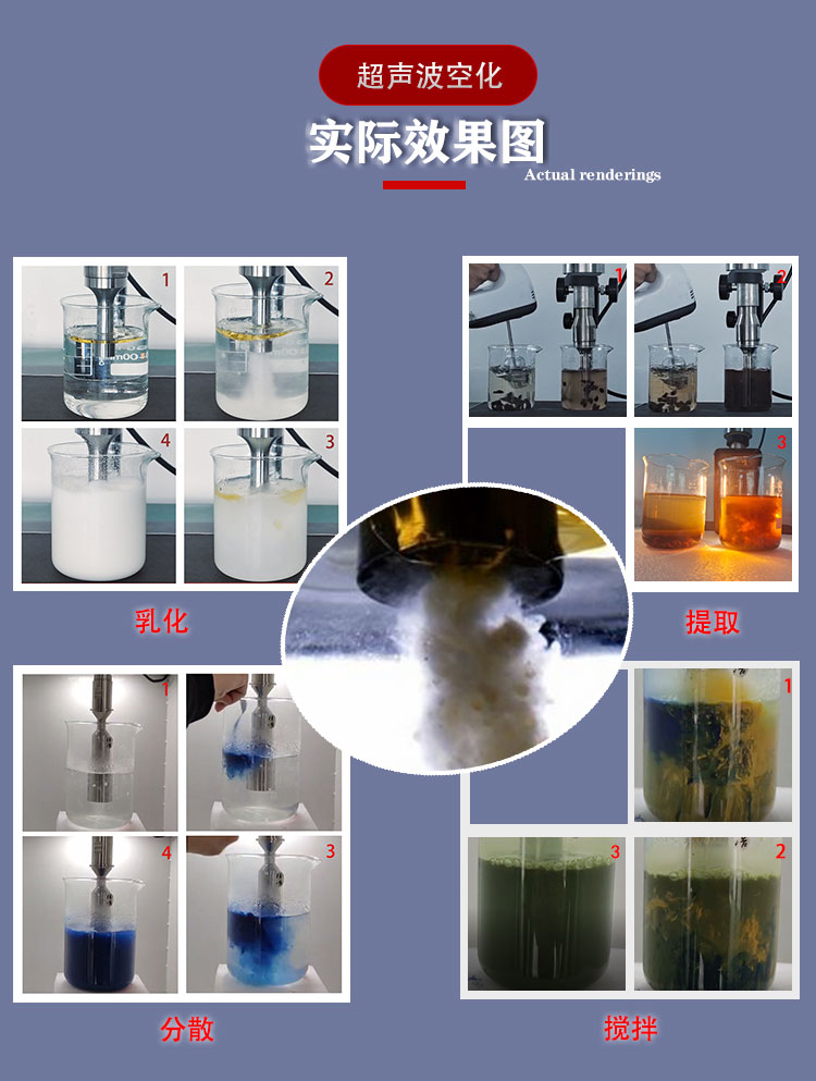 超聲波攪拌設(shè)備適用于各種溶液,包括高粘度溶液。常規(guī)功率為1.0kW至3.0kW。顆??梢苑稚⒌郊{米級。工業(yè)應(yīng)用通常將不同的液體或固體與液體混合以配制各種產(chǎn)品。如:液體飲料/藥品,油漆,涂料,洗滌劑等。為了更好地將各種物質(zhì)混合到溶液中,有必要將最初附聚的物質(zhì)分散到一個分散體中。超聲空化以每秒20000次的振動在液體中形成無數(shù)個高壓區(qū)和低壓區(qū),這些高低壓區(qū)不斷相互碰撞形成強大的微擊波,產(chǎn)生強大的剪切力,促使聚合物解聚。