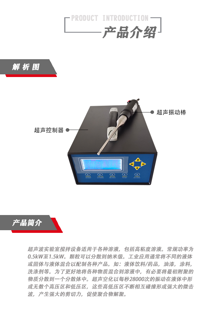 小型實(shí)驗(yàn)級(jí)800W超聲攪拌機(jī)適用于各種溶液,包括高粘度溶液。常規(guī)功率為0.5kW至1.5kW。顆粒可以分散到納米級(jí)。應(yīng)用通常將不同的液體或固體與液體混合以配制各種產(chǎn)品。如:液體飲料/藥品,油漆,涂料,洗滌劑等。為了更好地將各種物質(zhì)混合到溶液中,有必要將最初附聚的物質(zhì)分散到一個(gè)分散體中。超聲空化以每秒28000次的振動(dòng)在液體中形成無數(shù)個(gè)高壓區(qū)和低壓區(qū),這些高低壓區(qū)不斷相互碰撞形成強(qiáng)大的微擊波,產(chǎn)生強(qiáng)大的剪切力,促使聚合物解聚。