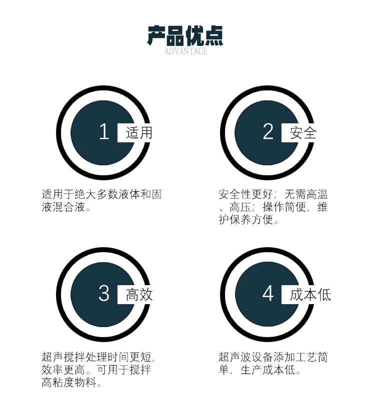 超聲二合一攪拌設備適用于各種溶液,包括高粘度溶液。常規(guī)功率為1.0kW至3.0kW。顆??梢苑稚⒌郊{米級。工業(yè)應用通常將不同的液體或固體與液體混合以配制各種產品。如:液體飲料/藥品,油漆,涂料,洗滌劑等。為了更好地將各種物質混合到溶液中,有必要將最初附聚的物質分散到一個分散體中。超聲空化以每秒20000次的振動在液體中形成無數個高壓區(qū)和低壓區(qū),這些高低壓區(qū)不斷相互碰撞形成強大的微擊波,產生強大的剪切力,促使聚合物解聚。