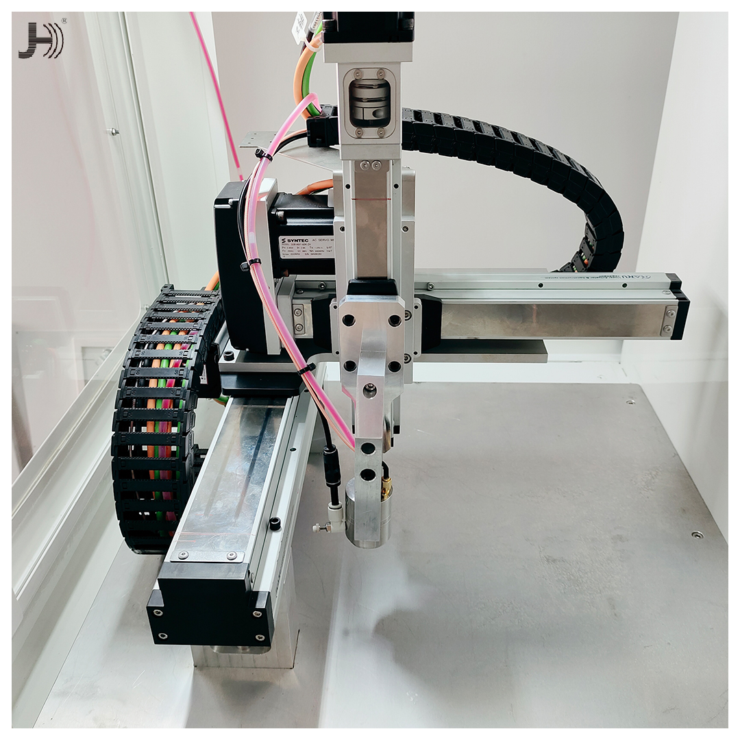 桌面式超聲噴涂機(jī)是一款中小型超聲波噴涂裝置,一般配60kHz超聲波噴頭。 根據(jù)噴涂要求不同,噴頭有聚攏型、發(fā)散型、螺旋型等可選。整個(gè)系統(tǒng)通過新 代運(yùn)動(dòng)系統(tǒng)實(shí)時(shí)控制,應(yīng)用G代碼編程,噴涂軌跡不受限。 超聲波噴涂是利用超聲波高頻振動(dòng)細(xì)化涂料顆粒,形成無壓細(xì)霧噴涂的一種 方式。超聲波噴涂機(jī)有不同的諧振頻率段,相同諧振頻率段下的相同涂料粒徑幾 乎一致。 諧振頻率越高,涂料粒徑越小。