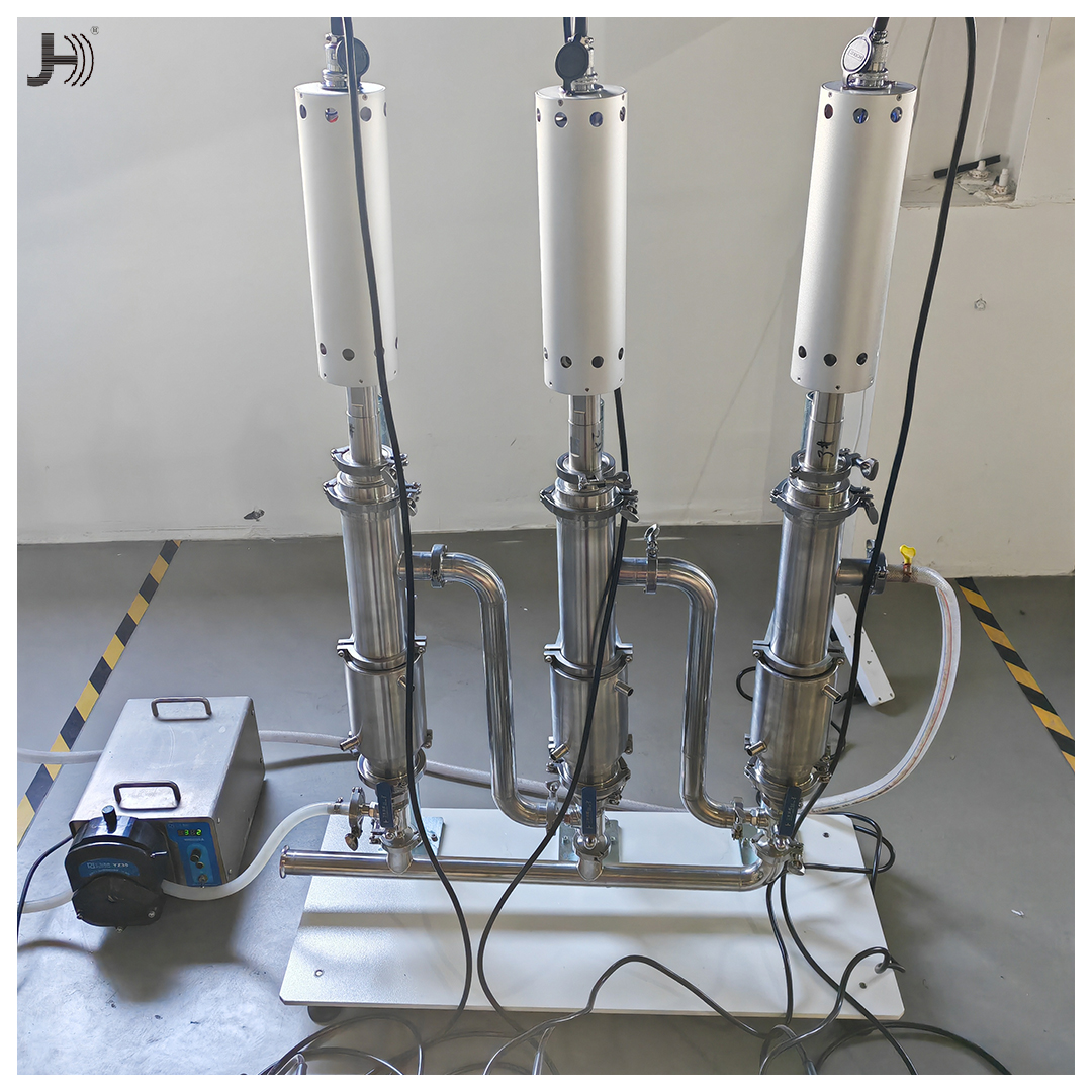 三合一型超聲分散設(shè)備適用于各種溶液,包括高粘度溶液。常規(guī)功率為1.0kW至3.0kW。顆??梢苑稚⒌郊{米級(jí)。工業(yè)應(yīng)用通常將不同的液體或固體與液體混合以配制各種產(chǎn)品。如:液體飲料/藥品,油漆,涂料,洗滌劑等。為了更好地將各種物質(zhì)混合到溶液中,有必要將最初附聚的物質(zhì)分散到一個(gè)分散體中。超聲空化以每秒20000次的振動(dòng)在液體中形成無(wú)數(shù)個(gè)高壓區(qū)和低壓區(qū),這些高低壓區(qū)不斷相互碰撞形成強(qiáng)大的微擊波,產(chǎn)生強(qiáng)大的剪切力,促使聚合物解聚。